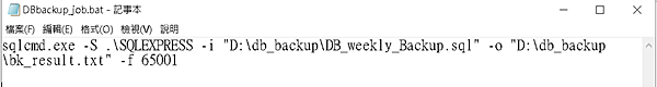 sqlcmd.exe -S "伺服器位置 " -i "SQL檔案路徑" -o "輸出結果路徑" -f 65001